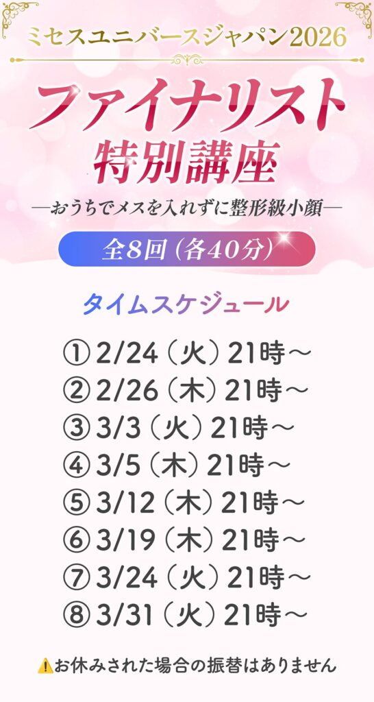 そして今回は【ミセスユニバースジャパン 2026】ファイナリスト様限定で、小顔レッスン特別コースをご用意いたしました!